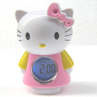 卡通型多功能语音报时钟 1.时间温度显示:可显示时、分钟和周围环境温度; 2.按动发光(屏幕),同时语音播报当前时间以及温度; 3.整点报时:可设置每一整点报时或者从早上7点到晚上9点整点报时; 4.定闹报时声音可开启或关闭; 5.可设置一组闹钟; 6.报时声音可选择音乐或DD声或公鸡叫声; 7.报时时间时长:一分钟; 8.外观尺寸:高13.5cm、宽8.5cm,视窗尺寸:3.5cm×3.5cm; 9.重量:145g(含包装,不含电池); 10.使用两节AA电池(五号电池); 11.按动右上角粉红色部分语音报时报温度。